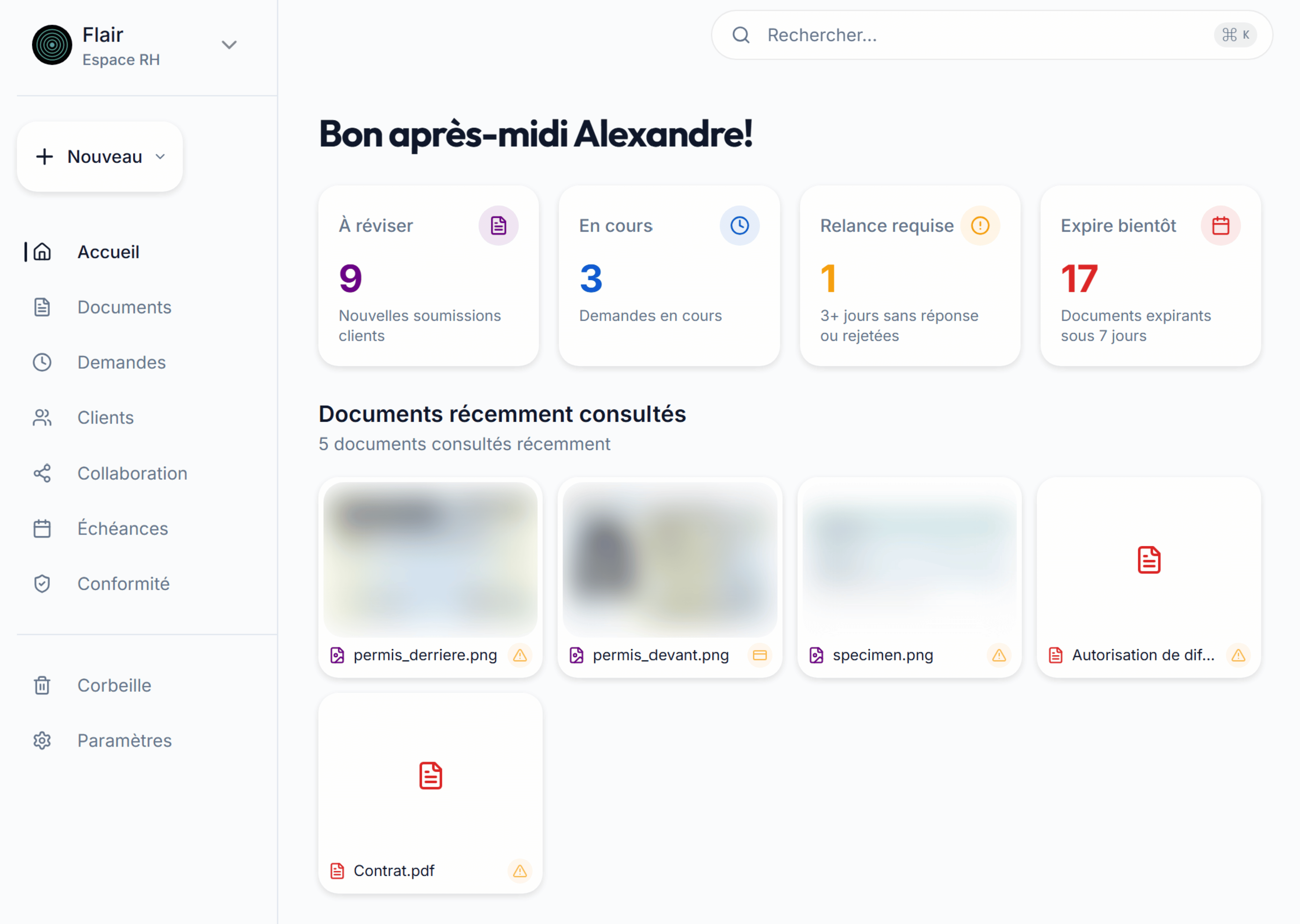 Créez une demande de documents en quelques clics. Votre client reçoit un lien sécurisé, dépose ses fichiers dans son portail, et vous êtes notifié automatiquement. Plus de relances, plus de fichiers manquants.